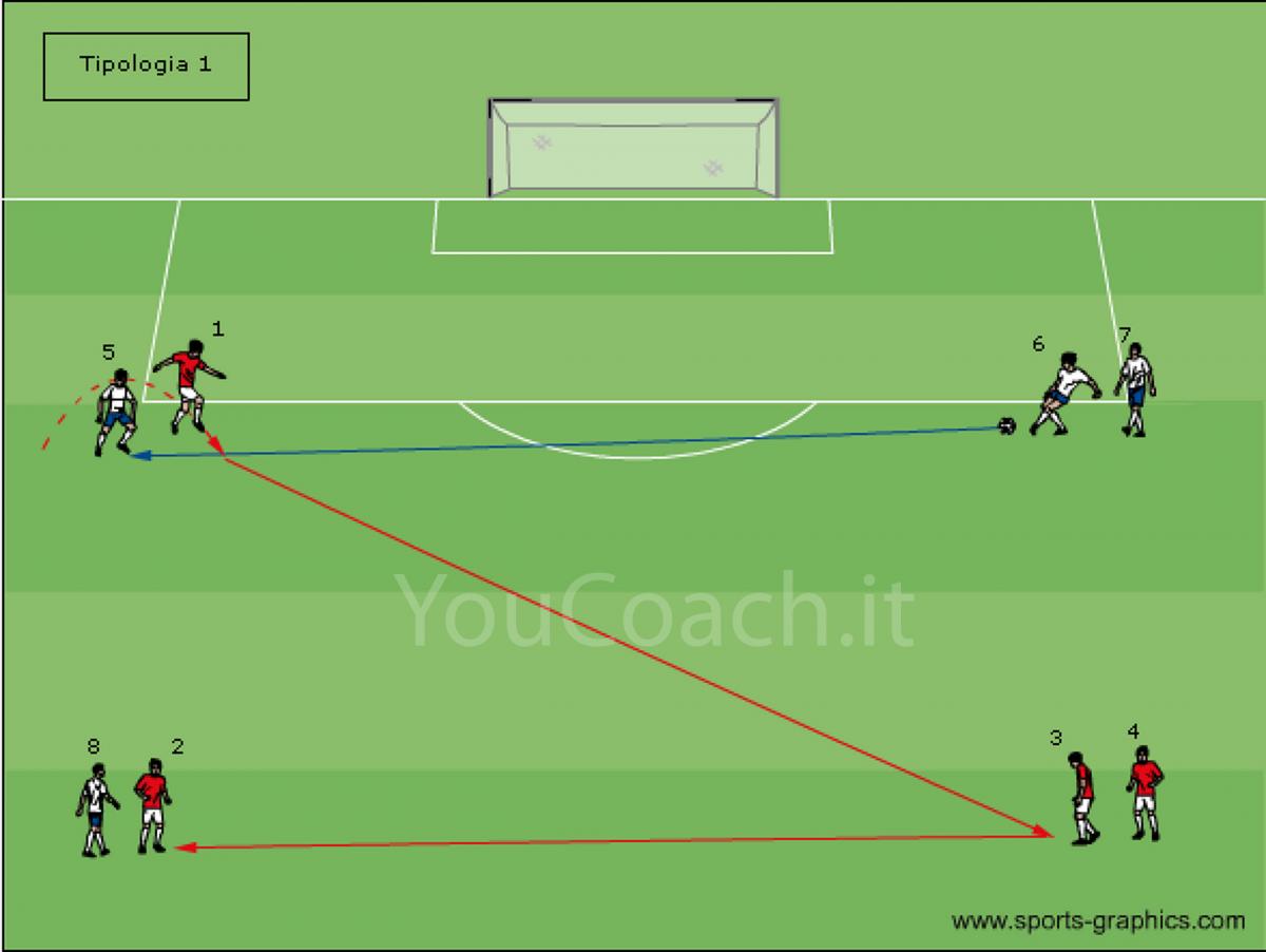 In una (Tipologia 1) viene fatto in uno spazio ristretto (30x30 metri circa) con otto giocatori disposti come in figura, a coppie. In un'altra (Tipologia 2) sempre con 8 giocatori, disposti a coprire metà campo per intero.
