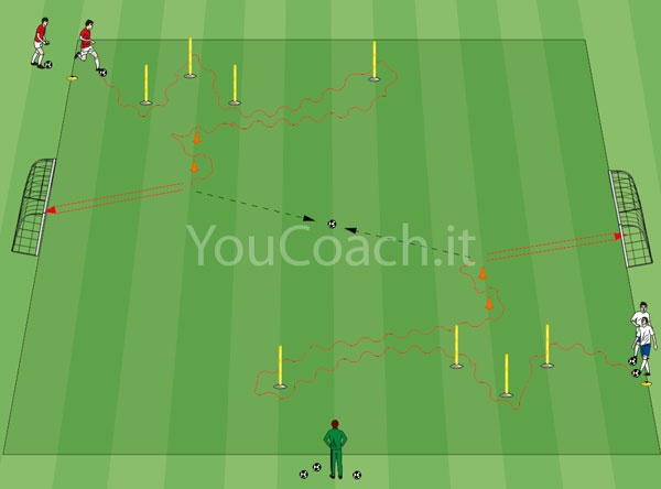 Formare due percorsi speculari con posizione di partenza diverse a fianco delle due porte. Dividere i giocatori in due gruppi. L'esercizio viene svolto da due giocatori che partono contemporaneamente al fischio dell'allenatore. Un pallone deve essere posizionato al centro del campo. Ogni giocatore ha un pallone. I giocatori possono utilizzare entrambi i piedi.