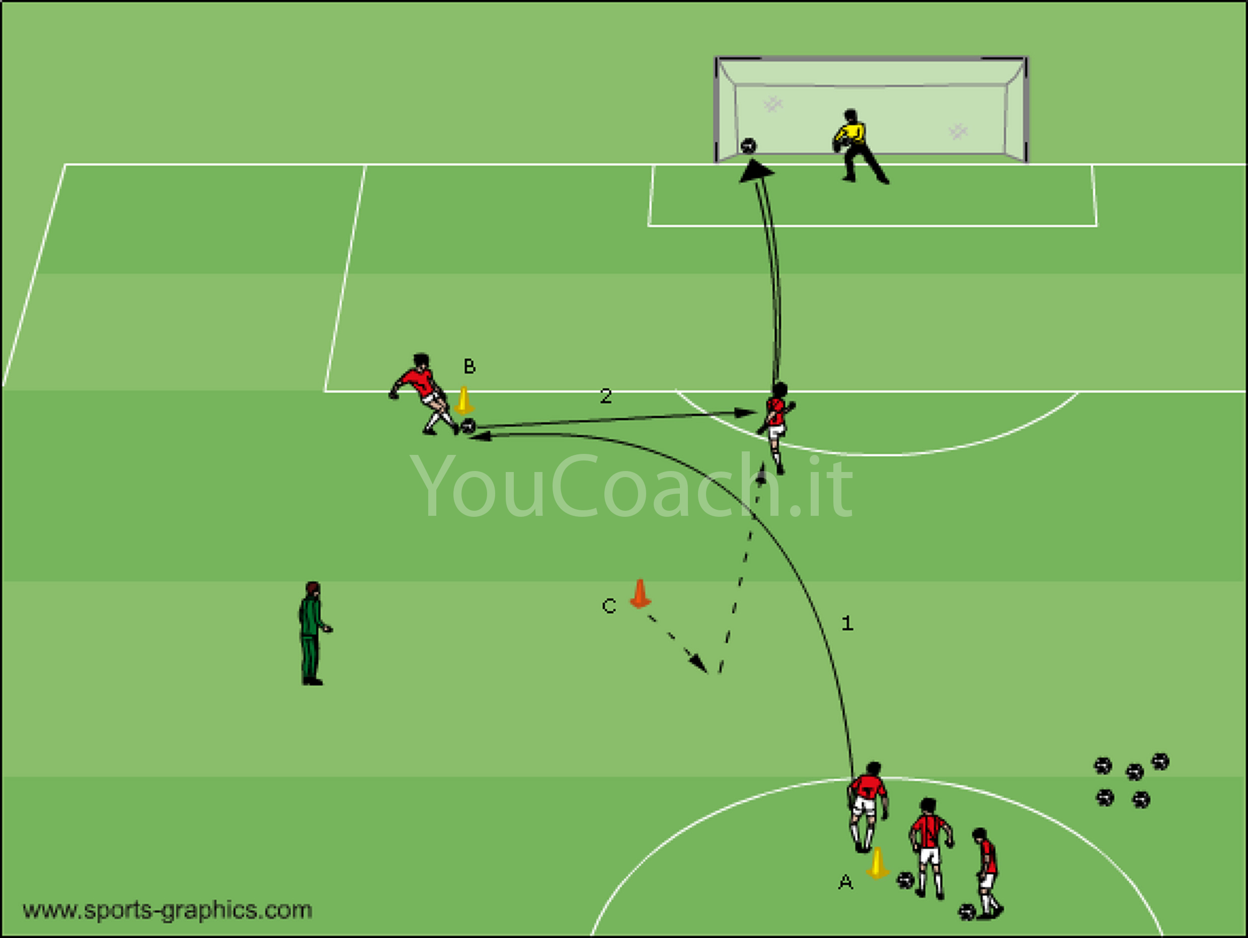 • Il giocatore in zona C, dovrà effettuare un movimento di avvicinamento al giocatore in zona A per poi scattare verso l'area di rigore, ricevere il passaggio del compagno e finalizzare l'azione con il tiro in porta