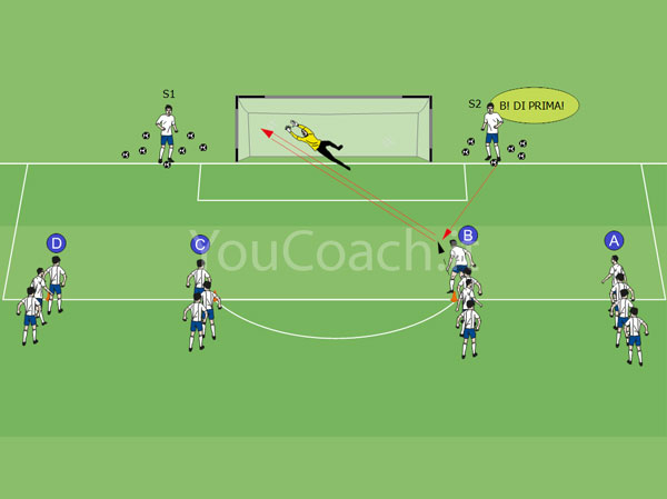 - Al segnale d'avvio dell'allenatore il primo servitore S1 chiama il nome del compagno (in questo caso A) e gli passa il pallone per la conclusione