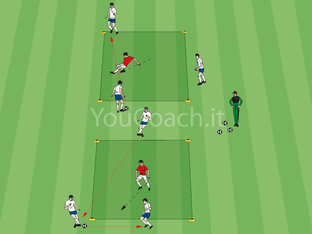 Formare due quadrati di 5x5 metri con i cinesini distanti l'uno dall'altro circa 3 metri. In ogni quadrato si posizionano 4 giocatori. All'interno del quadrato si posiziona un giocatore senza palla (casacca rossa) che svolge il ruolo di difensore. I restanti 3 giocatori stazionano sui lati, all'esterno del quadrato, con un pallone.