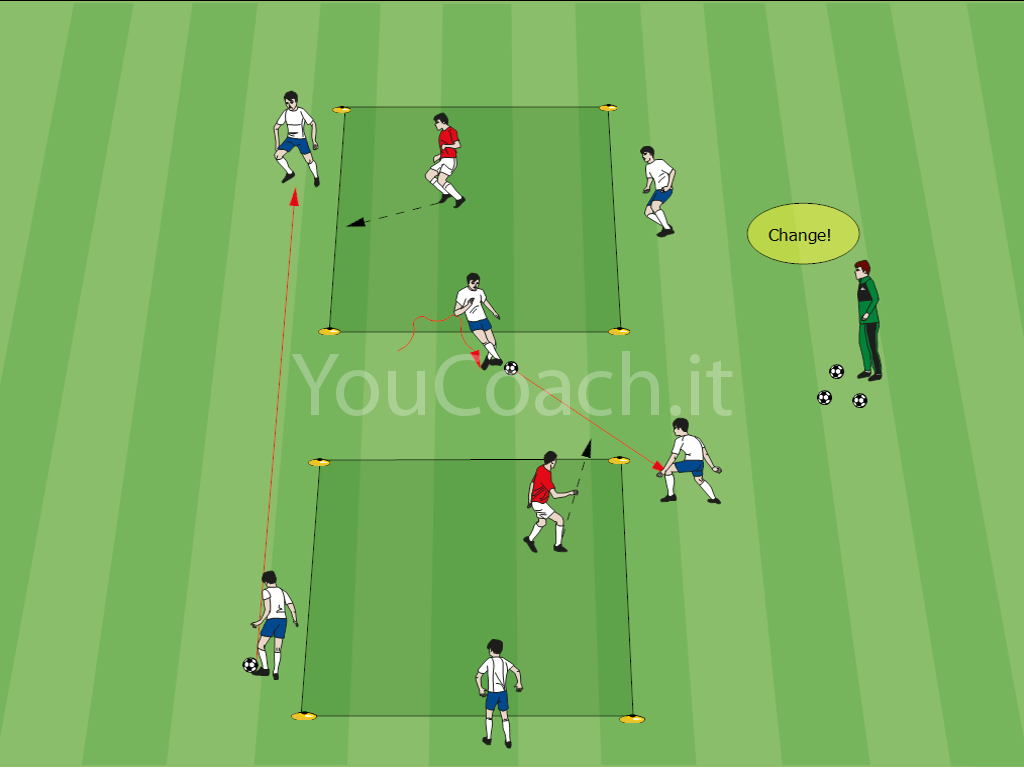 - Al comando dell'allenatore il giocatore in possesso del pallone deve passare la palla verso un giocatore libero dell'altro quadrato, cambiando quindi gioco