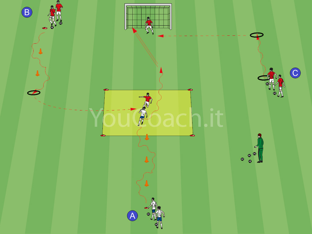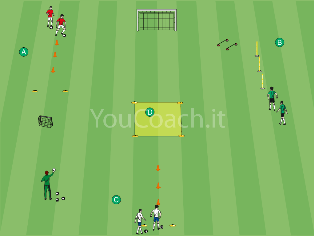 1 contro 1 - Esercizio utile a migliorare il corretto posizionamento, il dribbling, il contrasto e la finalizzazione |