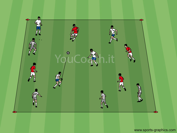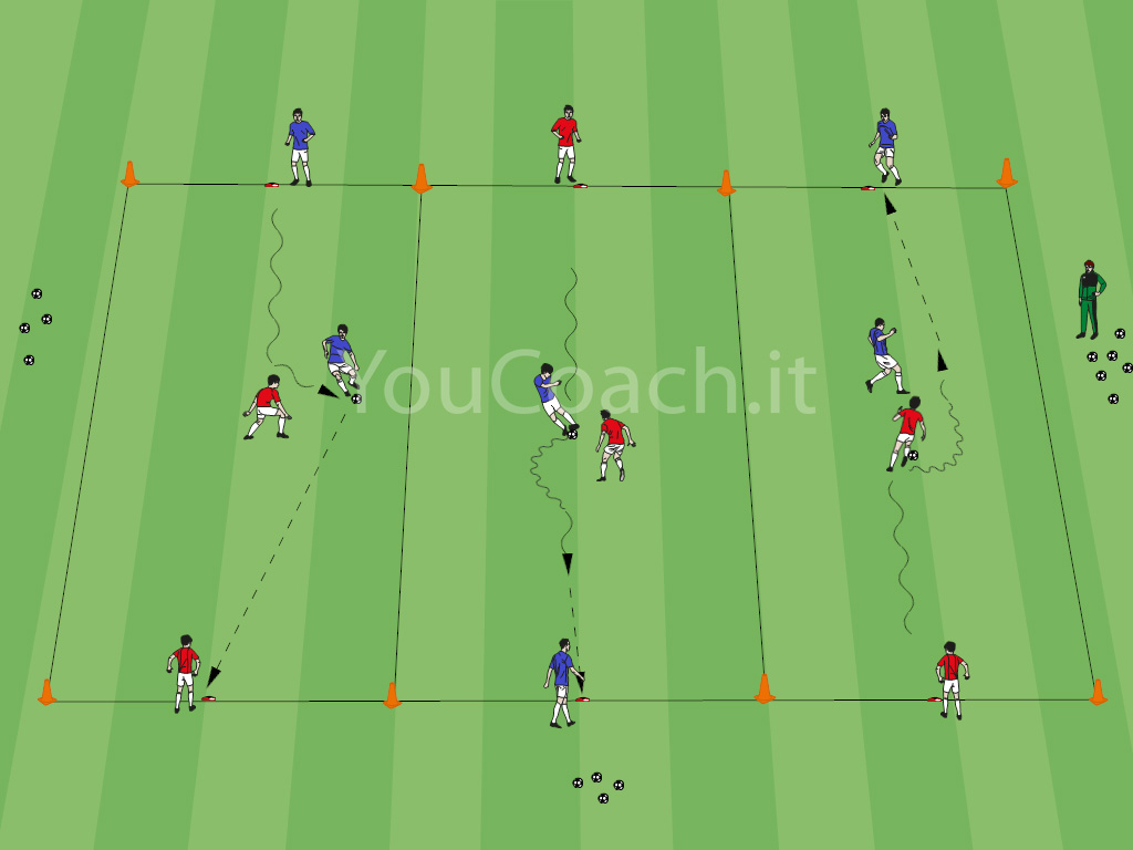 1 contro 1 - Esercitazione utile ad allenare presa di posizione, dribbling e contrasto |