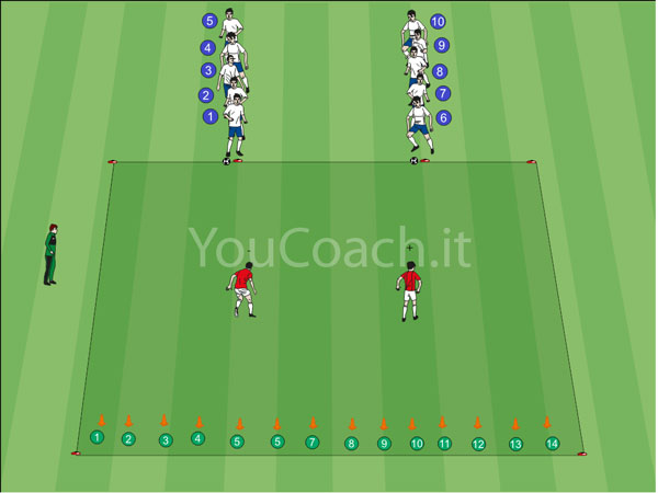 2 contro 1 - Esercizio situazionale per allenare i giovani calciatori al passaggio, allo smarcamento e alla presa di posizione |