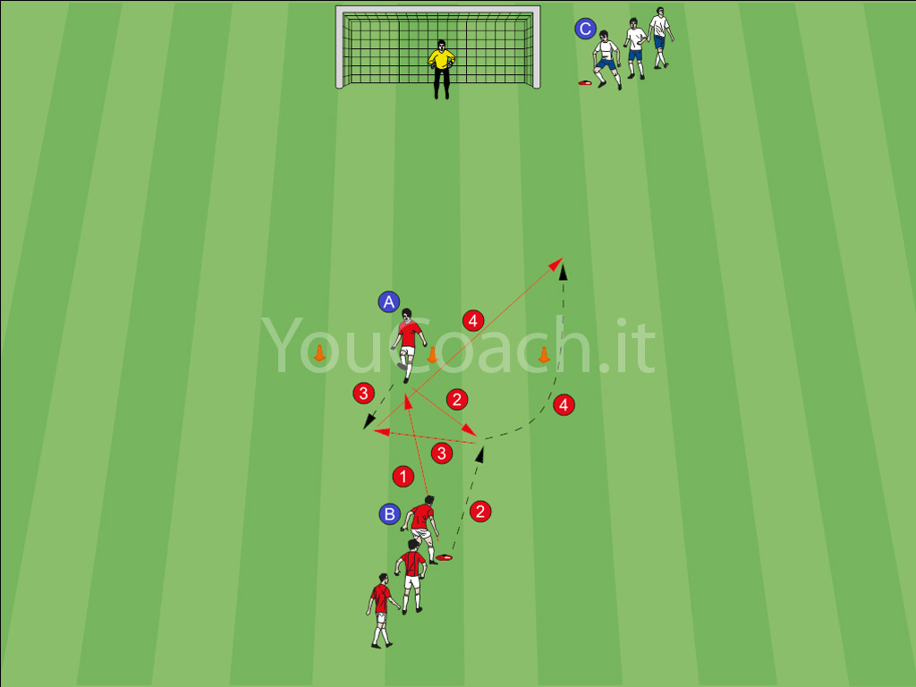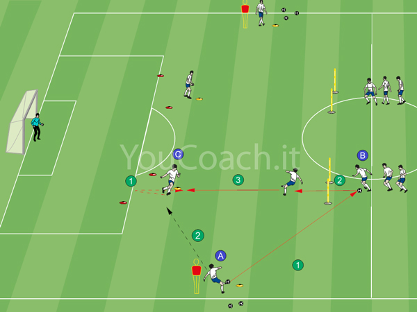 Tiro in porta - Allenare la finalizzazione a rete dopo uno scambio rapido al limite dell'area migliorando la collaborazione tra le catene laterali |