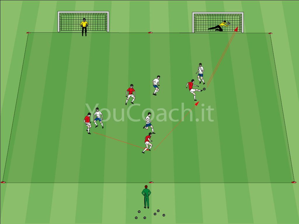 Tiro in porta - Esercizio di 4 contro 4 utile a migliorare il possesso la palla, la fase offensiva, la fase difensiva e la finalizzazione |