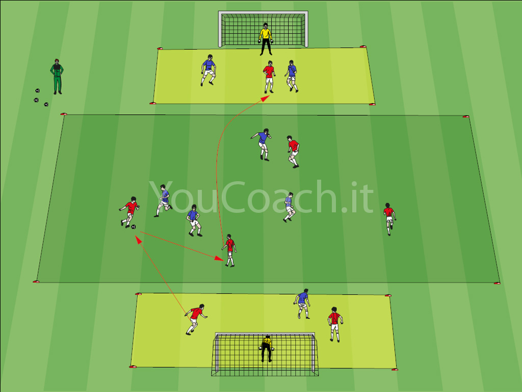 3 contro 3 - Esercizio utile ad allenare la ricerca della profondità e le fasi di transizione |