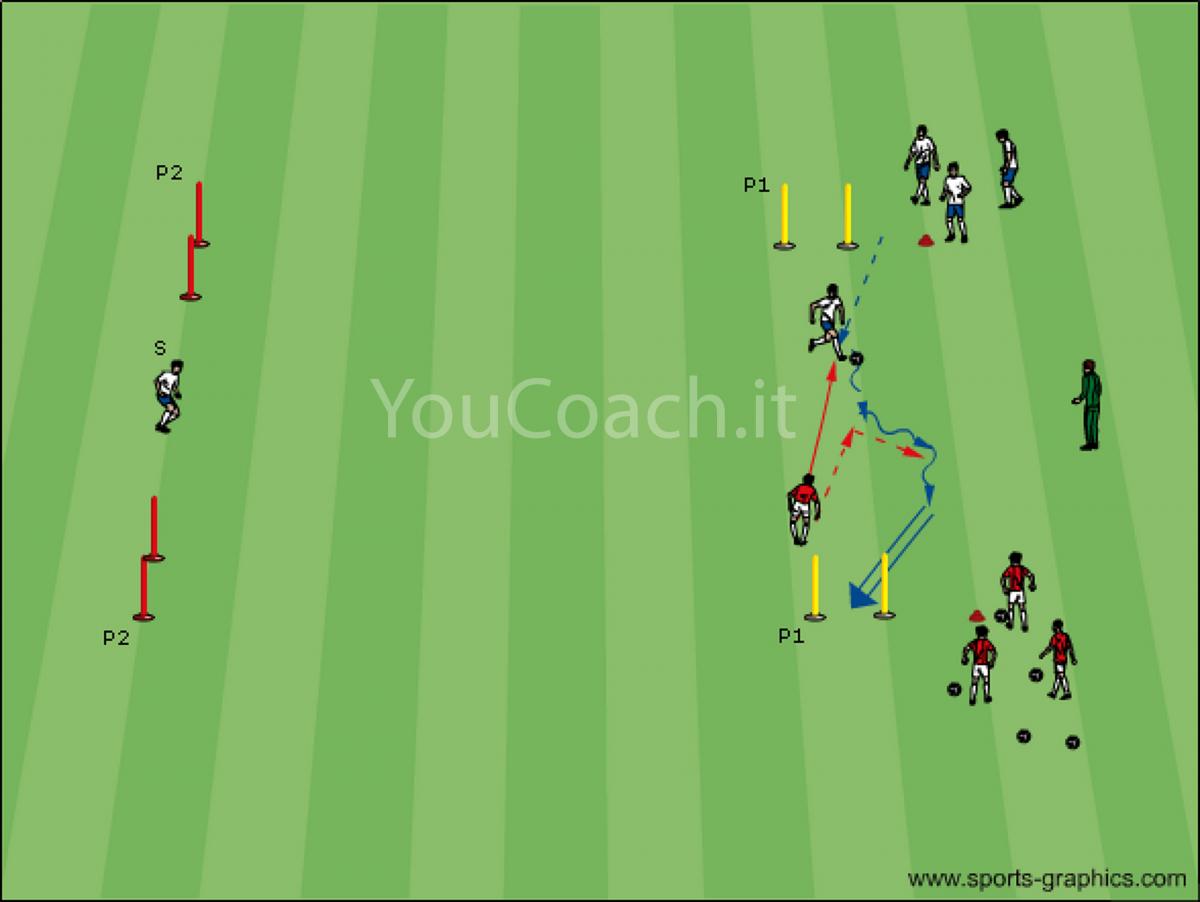2 contro 2 - Esercizio che allena situazioni di gioco difensive ed offensive |