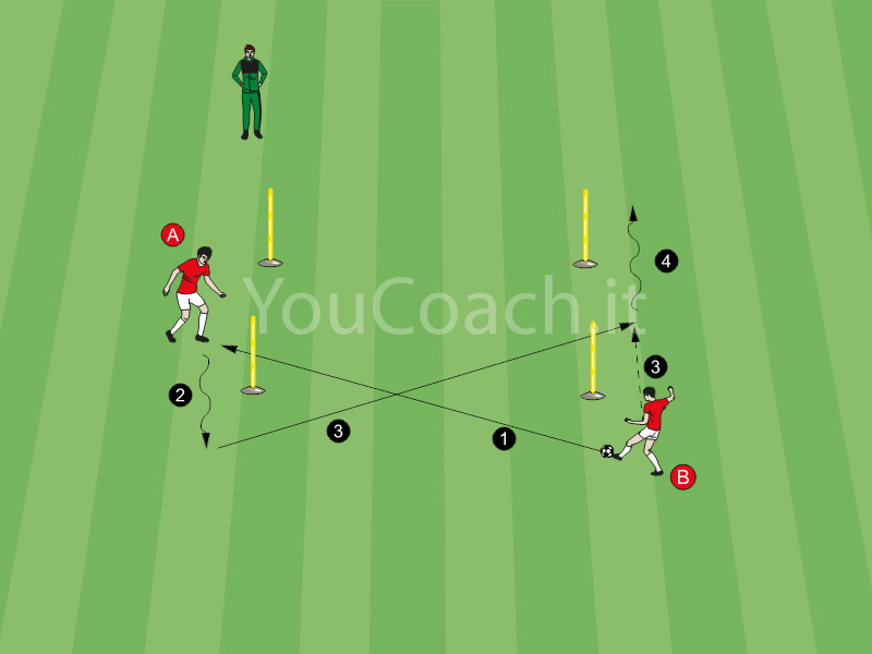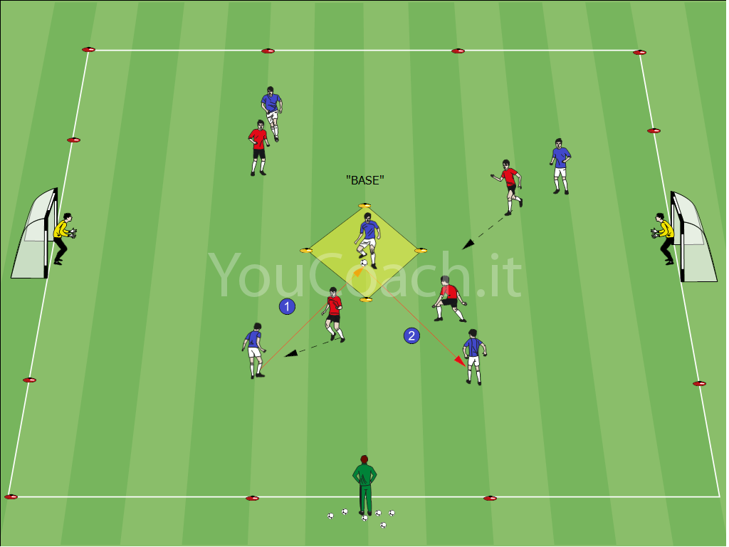 4 contro 4 - Esercizio utile a migliorare la precisione di passaggio, i movimenti in possesso palla e la copertura difensiva |
