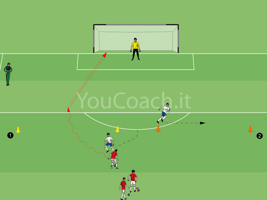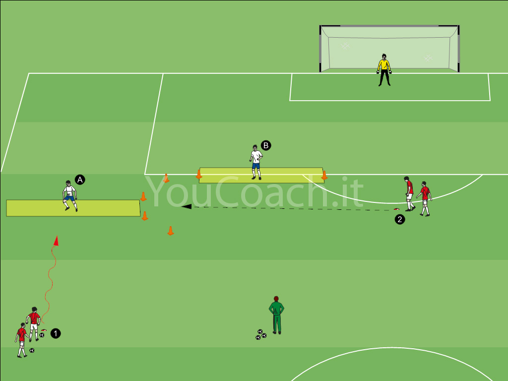 2 contro 1 - Esercizio situazionale dove i giocatori hanno la possibilità di scegliere il dribbling, una triangolazione oppure un cross per andare alla corretta finalizzazione |