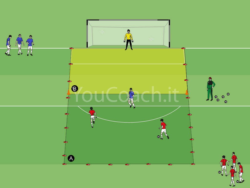 1 contro 1 - Gioco condizionato per lo sviluppo del possesso palla con obiettivo spaziale all'interno del campo |