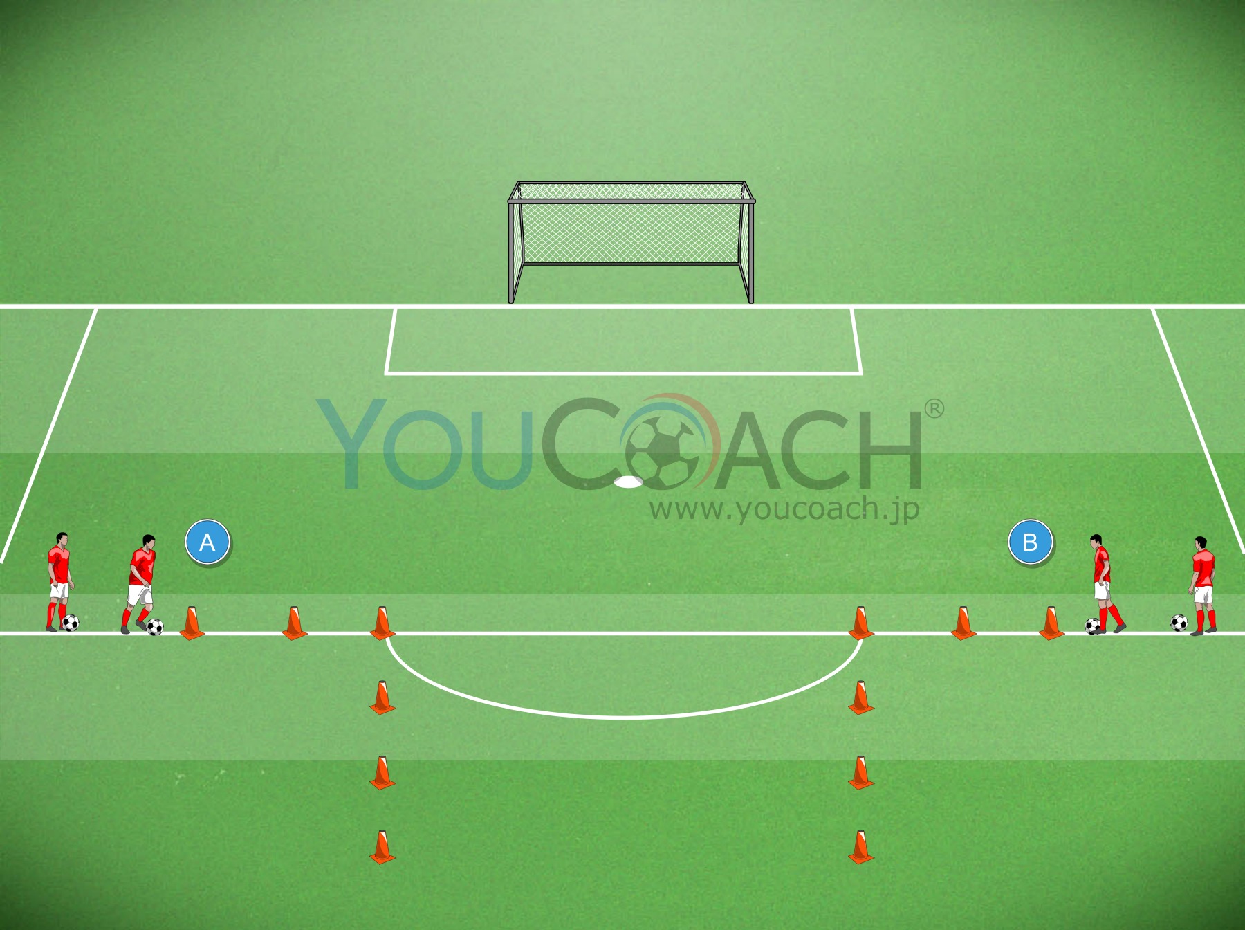 ボール扱い - ドリブルスラロームからのフィニッシュを競うレース形式トレーニングです |