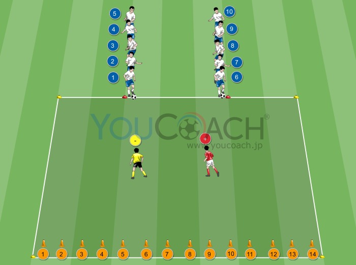 1対1 - このメニューを通じてポジショニング修正、ドリブル突破、球際の競り合い、フィニッシュ精度を鍛えます。 |
