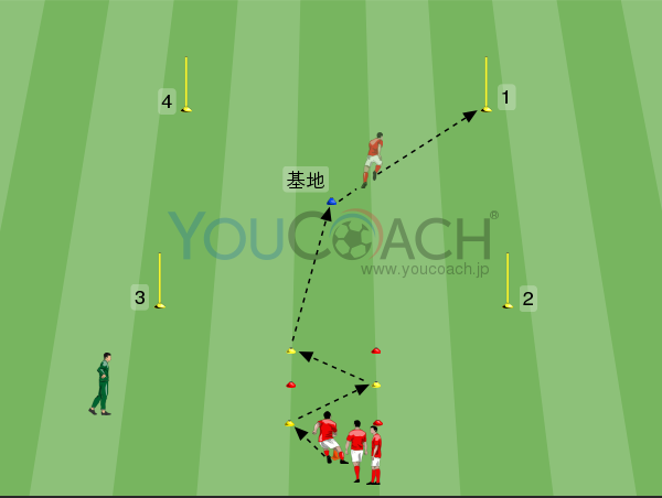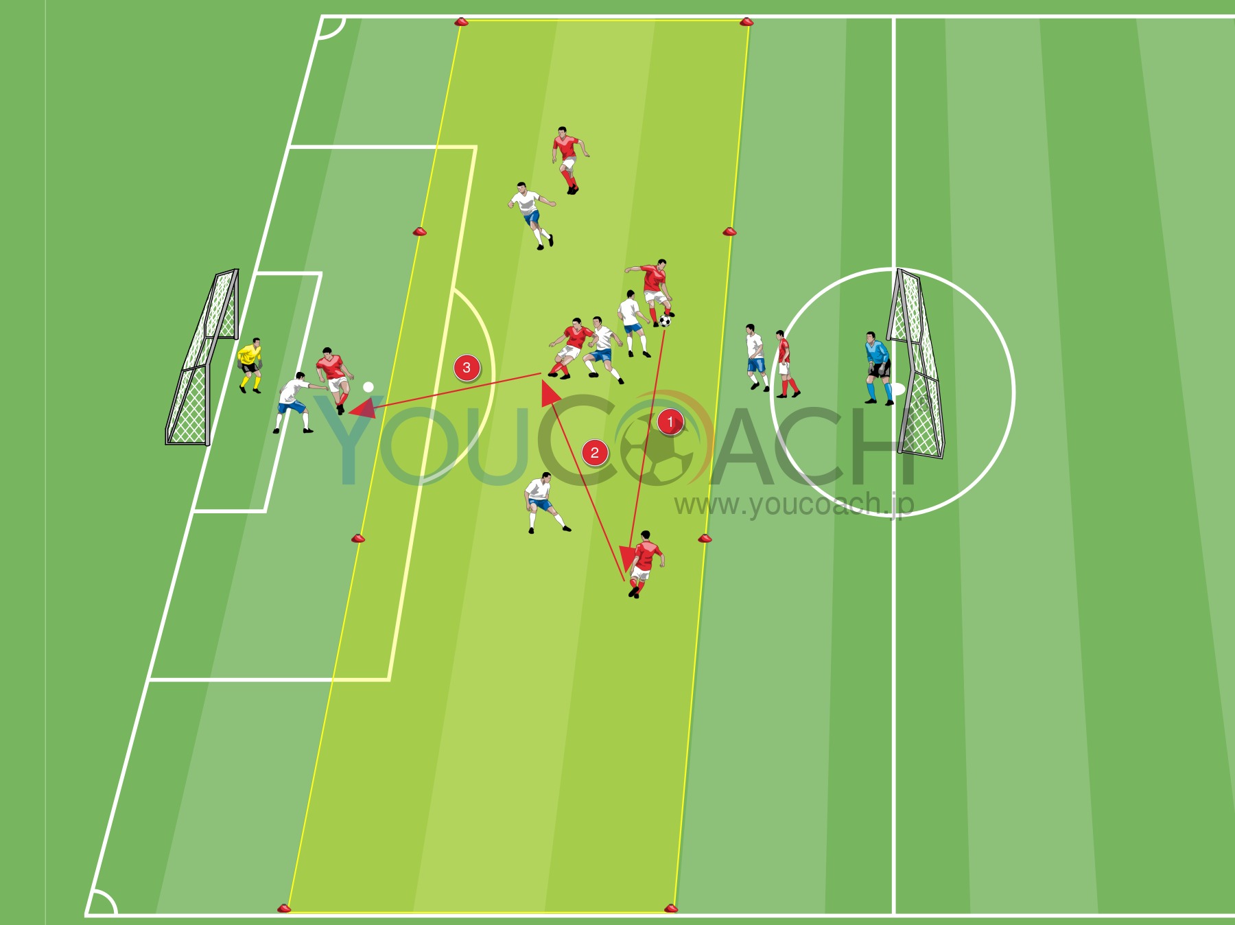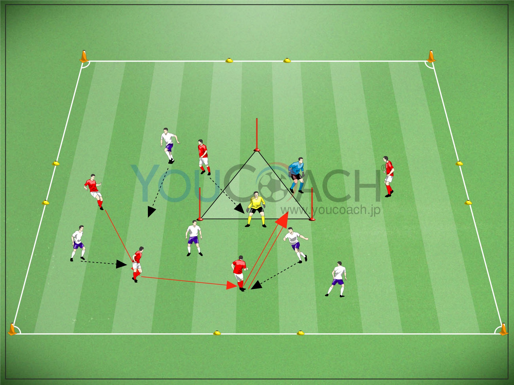 ボールポゼッション - ディフェンスを行うと同時にシュートまで持ち込む戦術を意識したテーマ形式トレーニングです。 |