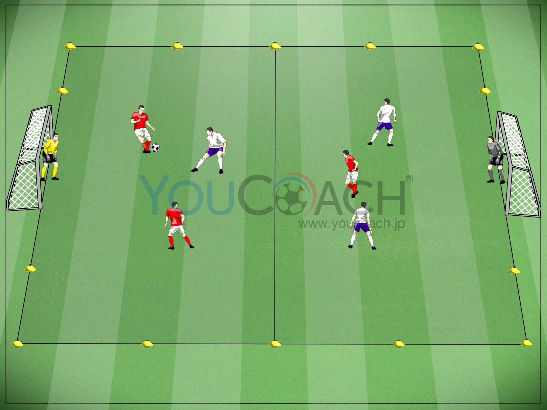 2ライン上での3対2 - 縦への展開とトランジションの能力を伸ばすと共に、有酸素性ポテンシャル(潜在能力)を高めます。 |