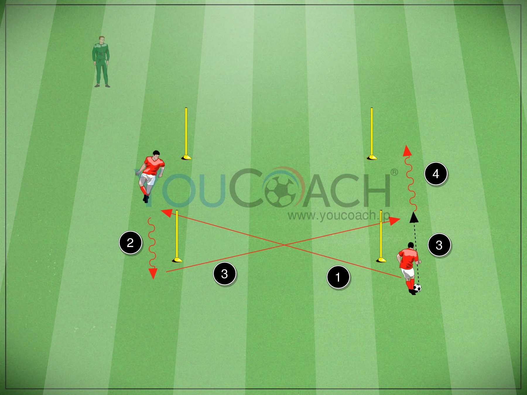 1対1 - コントロール・オリエンタート(方向付けされたトラップ)やドリブル突破、フィニッシュ精度の向上に最適な1対1のシチュエーショントレーニングです |