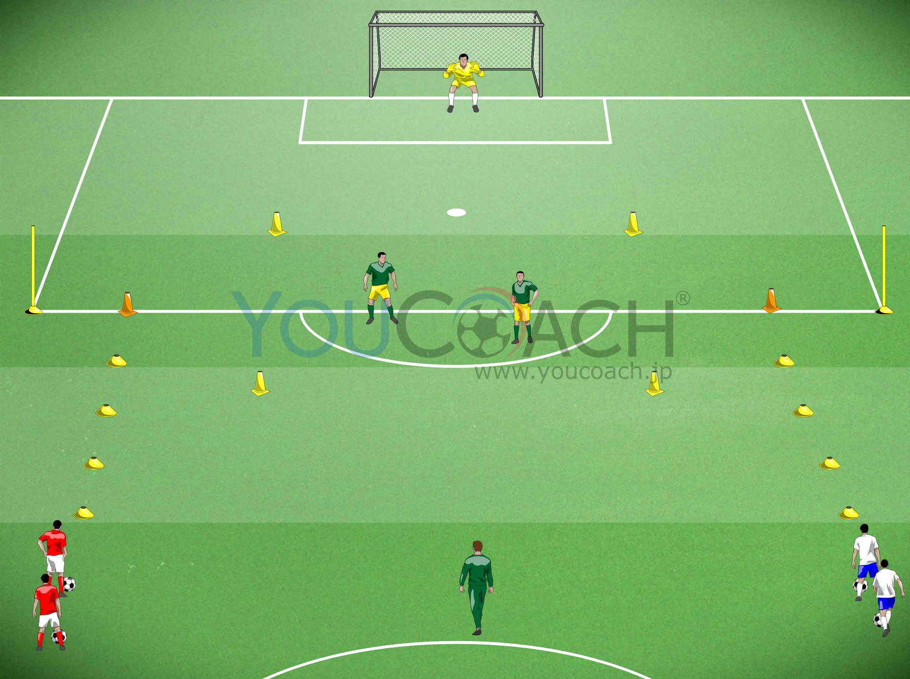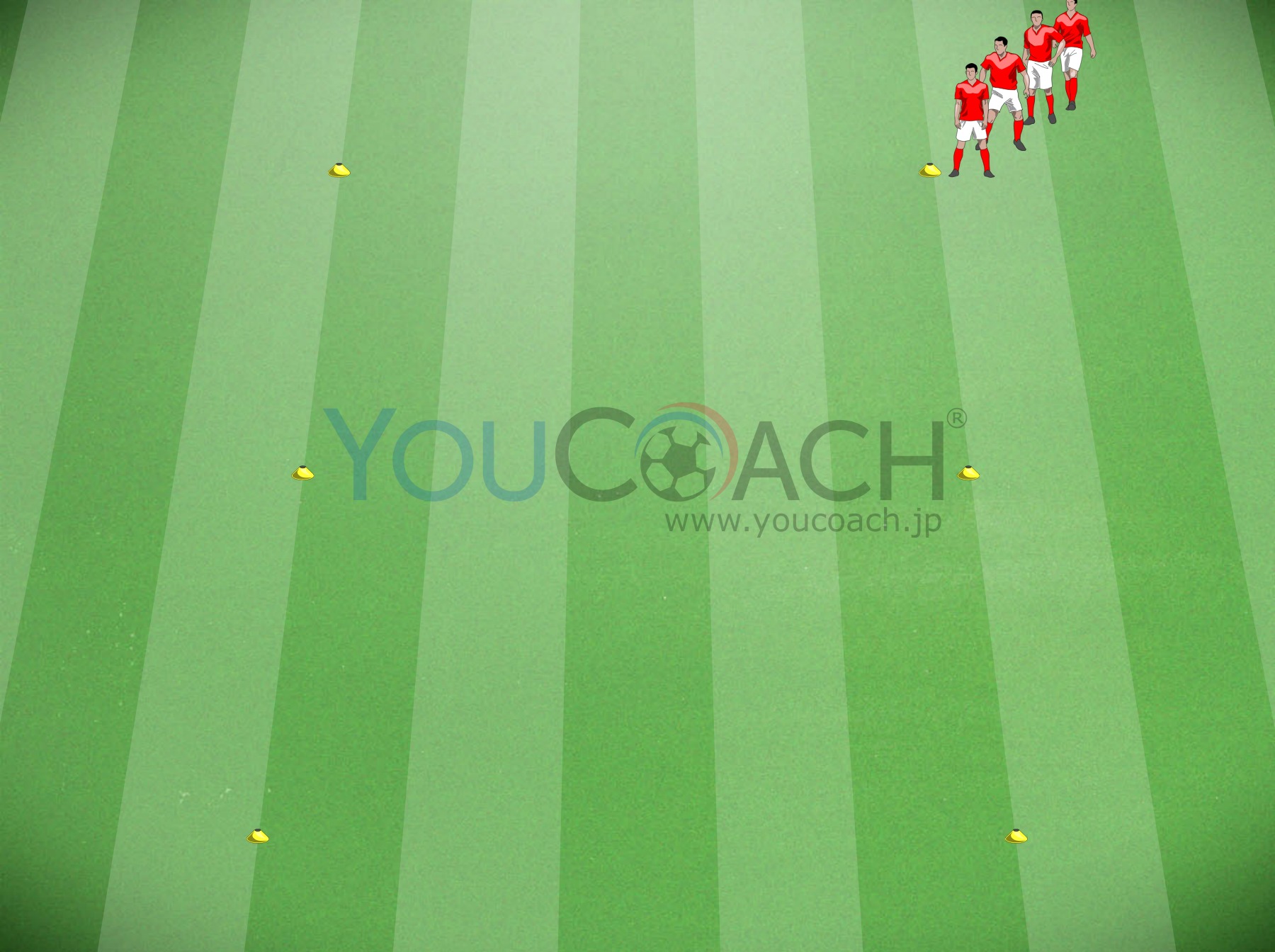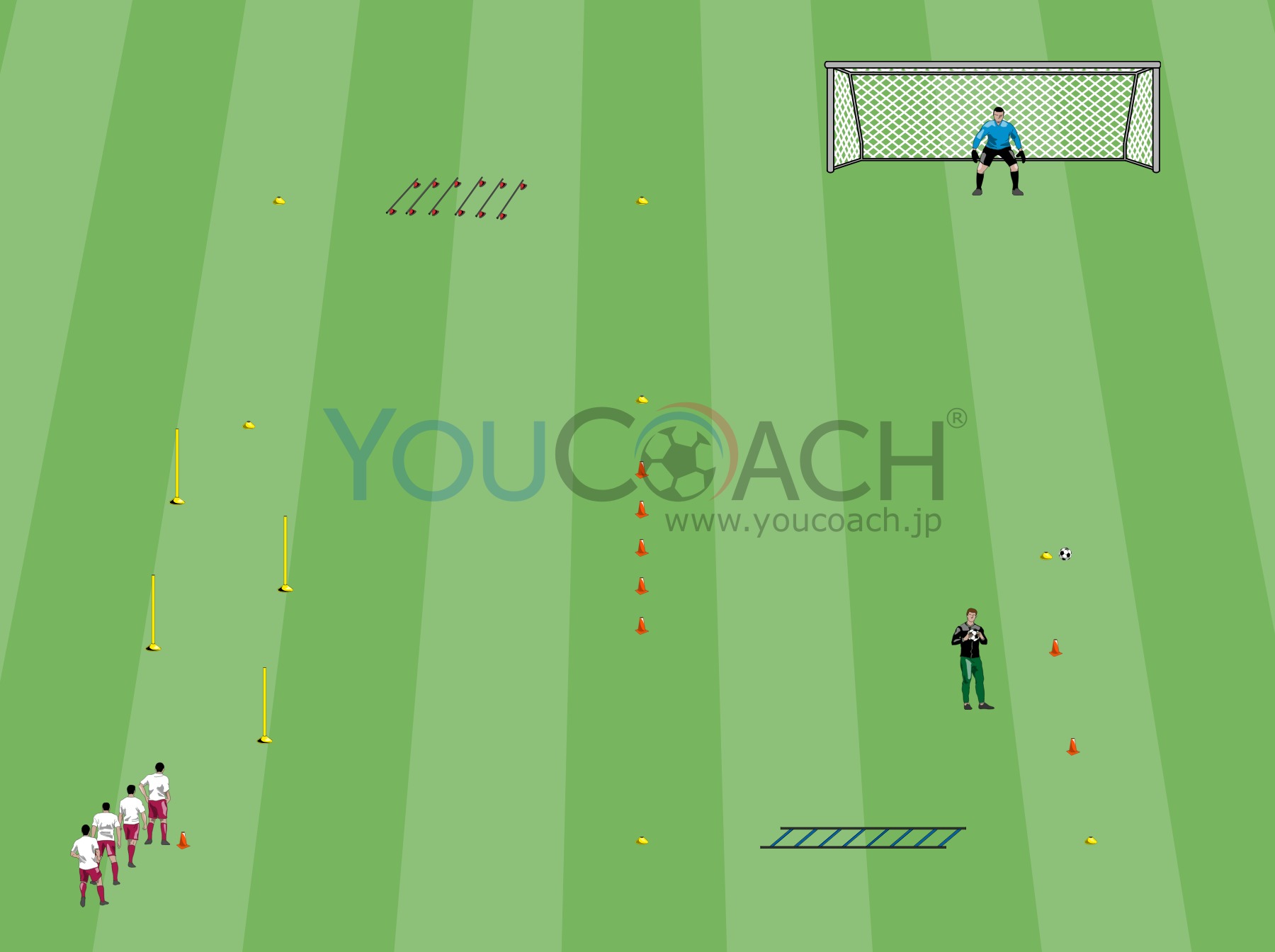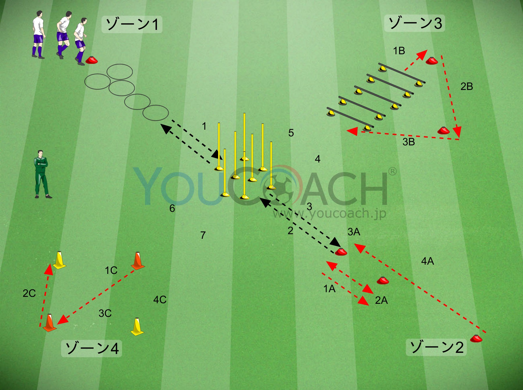 パス - このトレーニングは様々なプレイヤーが近づく動きをしながら一連のパス交換をするものである |