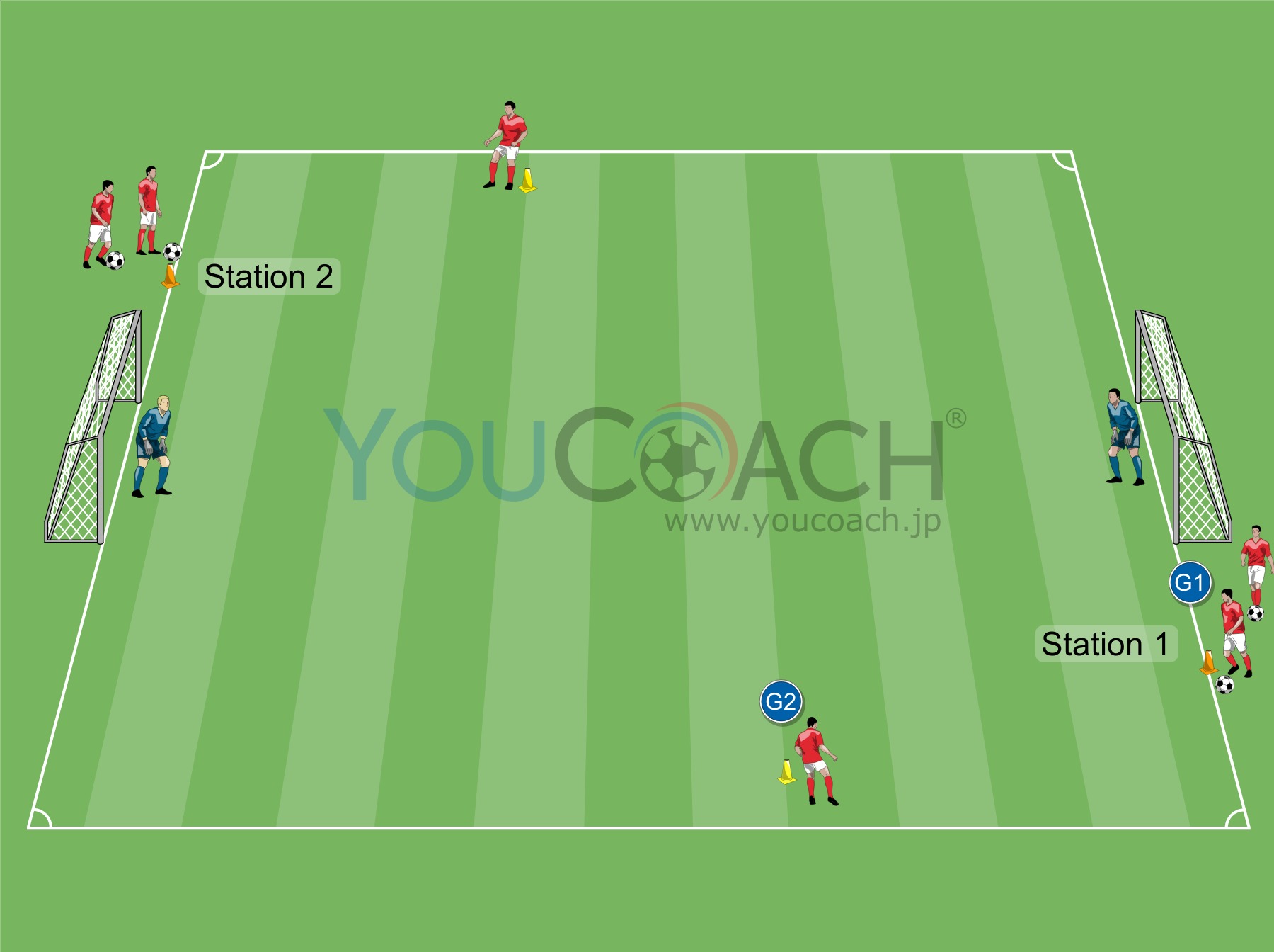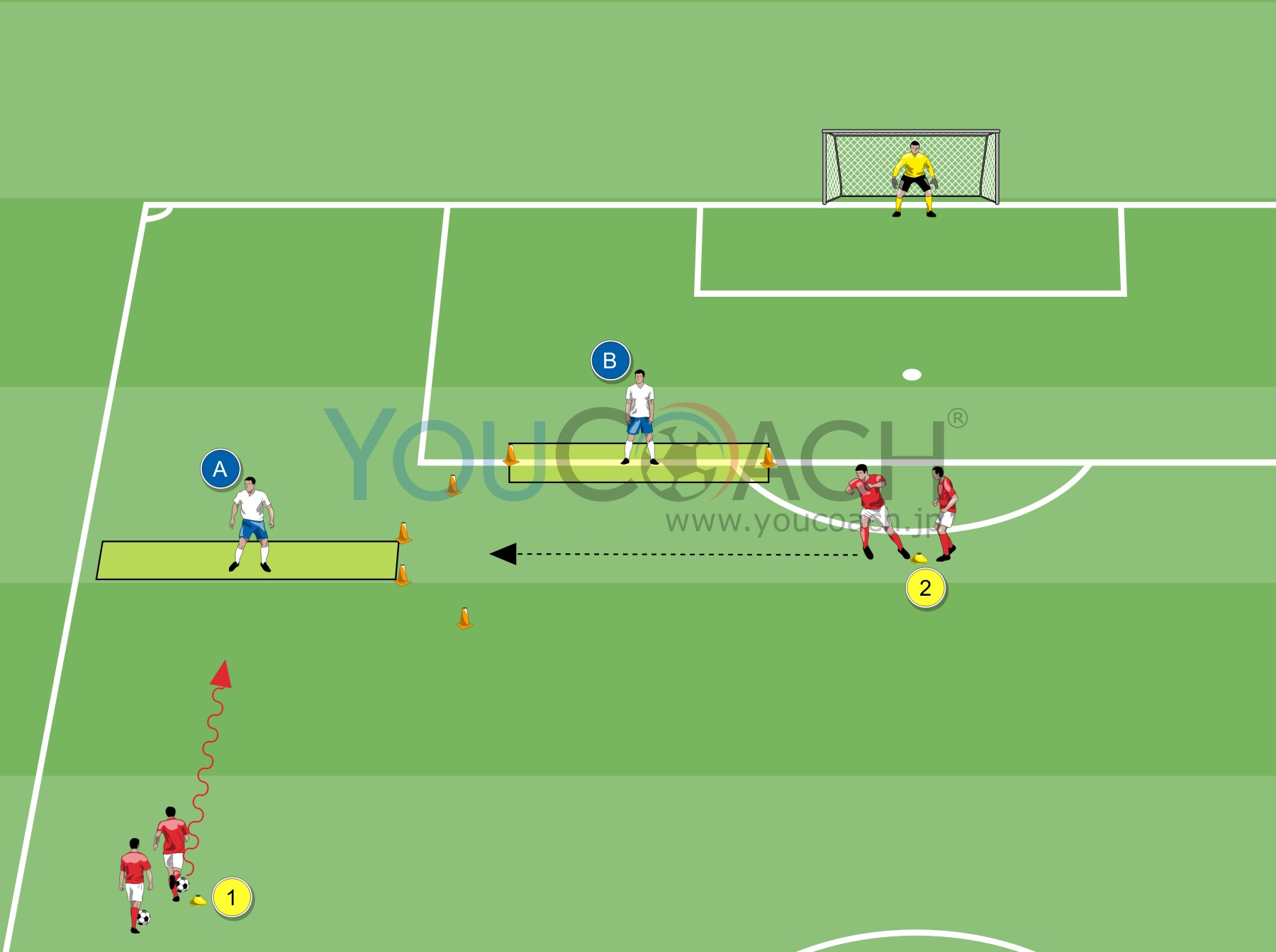 2対1 - フィニッシュの場面に至るまでに、プレーヤーには3つの選択肢がが与えられます。ドリブルで突破するか、味方との連携で崩すか(トライアングル)、クロス・シュートか、状況に応じて判断するシチュエーショントレーニング |