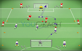 フィニッシュ - 前後のコースをケアすることによるGKの持久力、反応力、そしてフィールドプレーヤーのシュート精度を強化するスモールサイドゲームです -