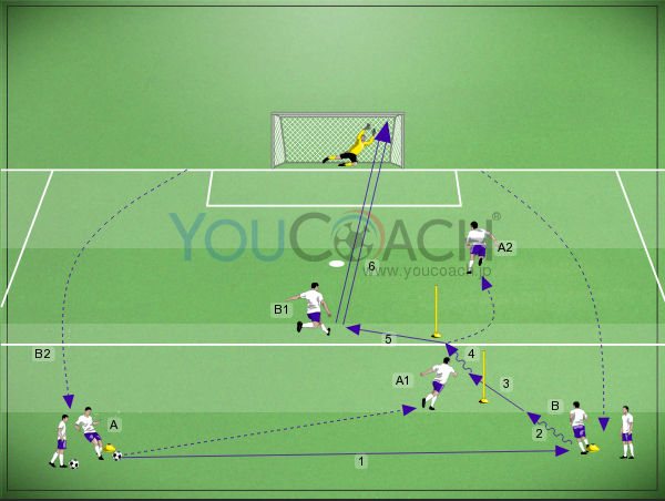 4 1月, 20182対1 - フィニッシュの場面に至るまでに、プレーヤーには3つの選択肢がが与えられます。ドリブルで突破するか、味方との連携で崩すか(トライアングル)、クロス・シュートか、状況に応じて判断するシチュエーショントレーニング -